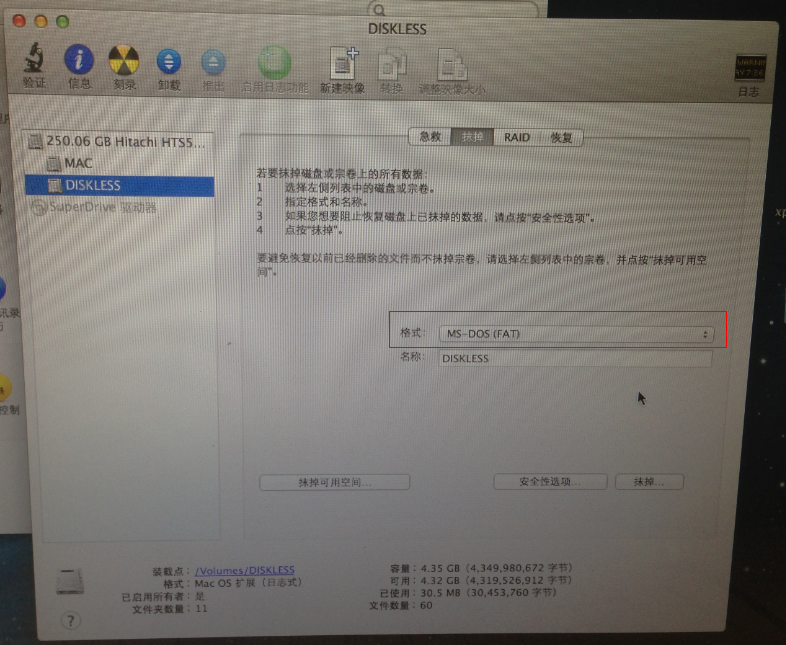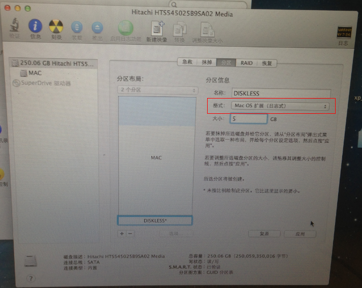 2、 使用Mac OS的磁盘工具新分一个Fat32分区。
