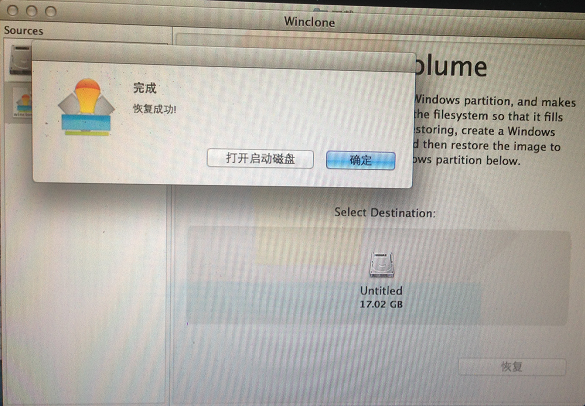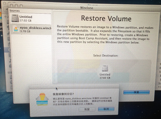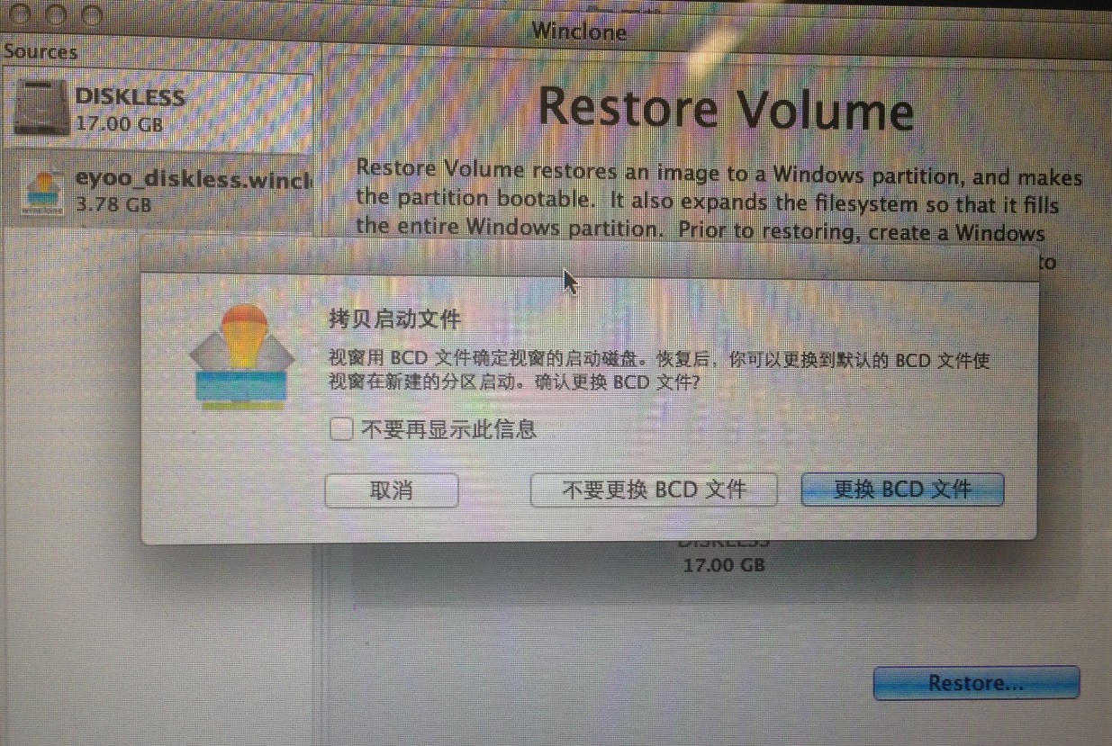 4、 找到xxx_iMac_deploy.winclone文件,双击打开。选中DISKLESS,点击Restore按钮,进行恢复,如下图