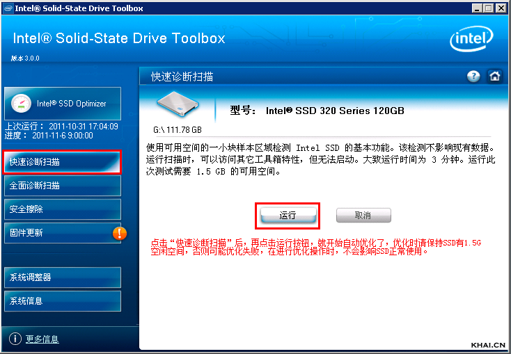 第二步:点击下图红框中的运行就开始优化了。优化过程请确保SSD有1.5G空闲空间,否则可能优化失败,另外在优化SSD的过程中,并不会影响SSD使用,所以在任何时间都可以对SSD进行优化。