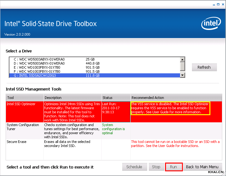 12、启动Intel SSD ToolBox后,为什么优化选项中的Run按钮是灰色的?