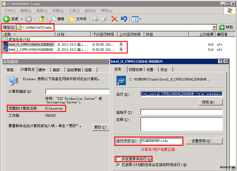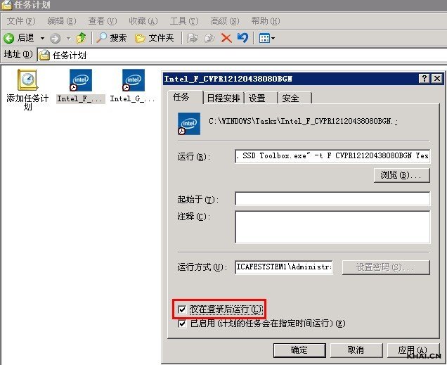 答:这可能是因为您使用了3389登陆或服务器重启后未自动登陆系统导致的,您可以在设置好计划任务后,到C:WINDOWSTasks,双击Intel图标的计划任务,然后取消下图中“仅在登陆后运行的选项”即可。
