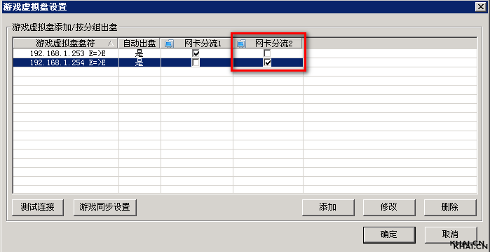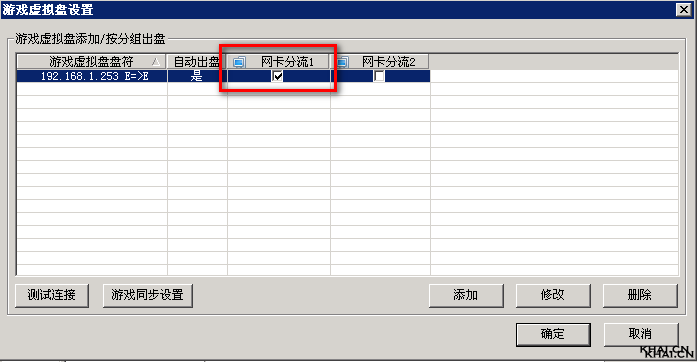 到这里分组已经设置完毕了,我们来添加游戏虚拟盘,首先添加第一块网卡的虚拟盘,点击控制台左上角游戏虚拟盘按钮,点击添加按钮,输入服务器IP:192.168.1.253、服务器盘符E、客户机出盘盘符E等信息后点击添加,添加完成后将虚拟盘配置给“网卡分流1”这个分组中,如下图: