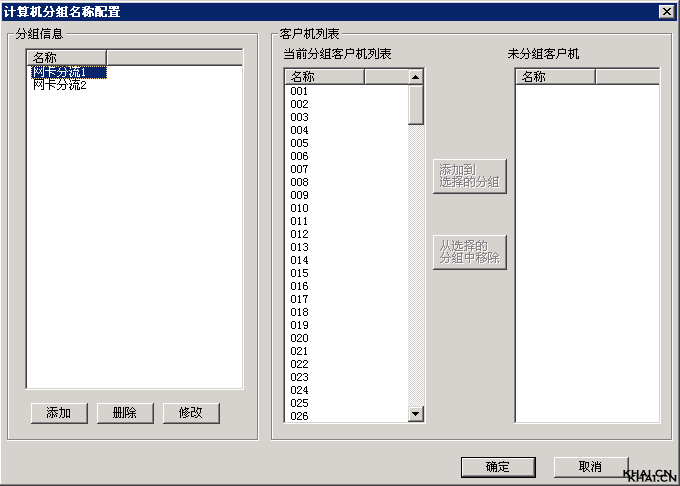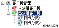 当添加好分组以后,将我们需要使用 192.168.1.253 网卡的客户机放到“分流网卡1”这个分组中,将 192.168.1.254 这块网卡需要带的客户机放到“分流网卡2”这个分组中。这样我们的两个分流分组就建立好了。如下图: