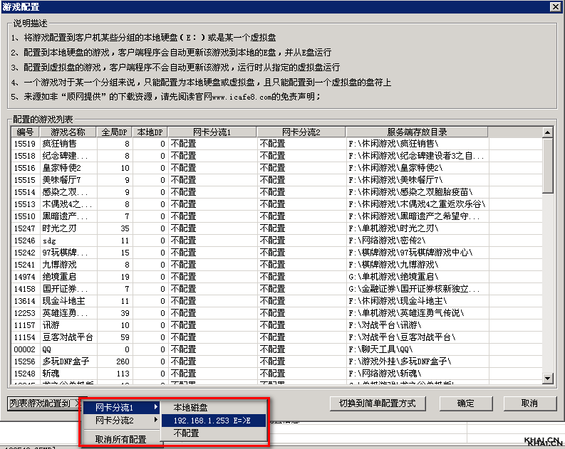 到这里,我们的网卡分流配置就已经完成了,最后我们要做什么呢?还没有游戏是吧?我们配置一下游戏。将所有游戏配置到“网卡分流1”所在的分组下192.168.1.253 E=>E这个虚拟盘上,在本机已有游戏-右键-游戏配置,如下图: