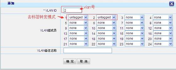 2、配置VLAN ID,选择端口转发模式,模式选择“untagged”脱标签转发。1号口作为公共口,加入到多个vlan隔离组里。配置好后点击确定,保存配置。