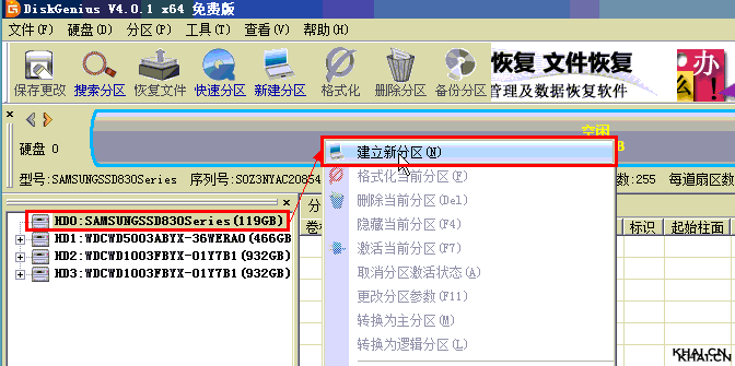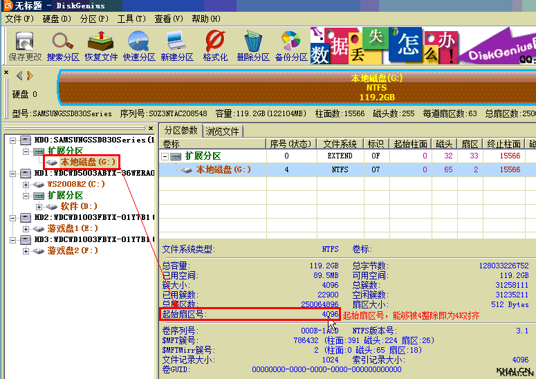 方法一:使用DiskGenius这个工具,选中你刚刚建立好的分区,然后查看起始扇区号,假如起始扇区号能够被4整除,那么就代表已经4K对齐。