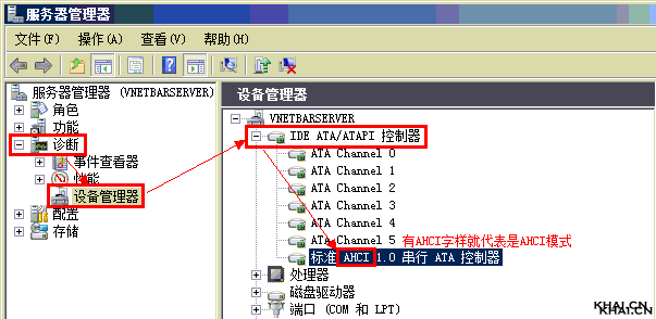 那么,我如何确认我的服务器是否处于AHCI磁盘模式呢?其实方法很简单,在服务器上,“我的电脑”=》“管理”=》“诊断”=》“设备管理器”=》“IDE ATA/ATAPI控制器”,点开加号,看到“AHCI”字样的磁盘控制器,就代表当前磁盘模式为“AHCI”模式,如下图: