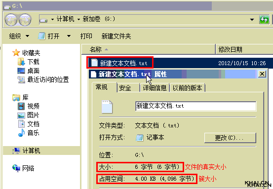答:很简单,在你要查看的分区内,新建一个文本文档(txt文件),然后随便输入几个字母,比如输入“abc”,然后保存,在这个记事本文档上,右键,属性,即可看到下图的信息,在下图中“占用空间”即为簇大小。