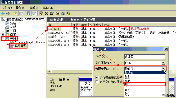 使用SSD时,无论你是用来做回写盘,做镜像盘,做游戏盘,做SSD缓存,在格式化分区的时候,都要用4KB(4096)即系统默认大小来格式化,否则无法正常使用SSD优化工具来优化SSD。
