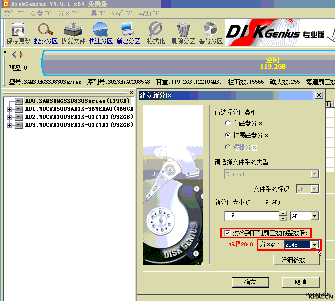 3、新建分区界面,选择“对齐到下列扇区的整倍数”,然后选择“2048”点确定,这样4K对齐就做好了!