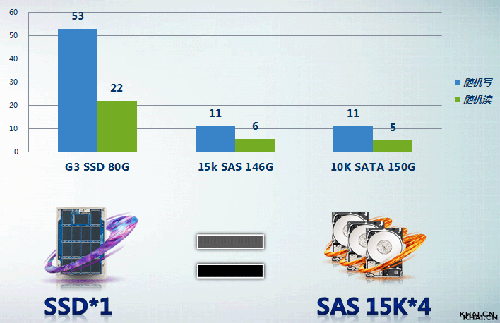 在性能角度讲,一块Intel G3 80G的SSD硬盘的性能等同于3~4块SAS盘,N块7200转的SATA硬盘。性能数据图如下: