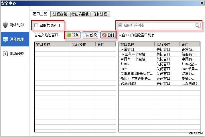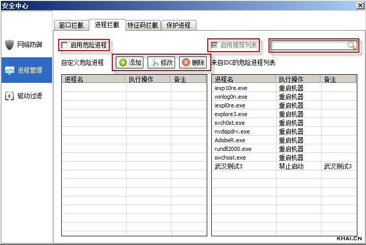 要使用进程拦截功能,请勾选“启用危险进程”,如果不勾选该项,后面的“启用推荐列表”及“搜索框”为灰置状