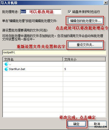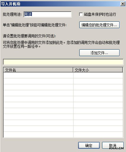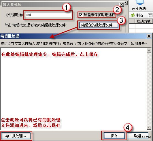 3.输入用途,如test,如果需要客户机磁盘在未保护的情况下开机批处理有效,请勾上“磁盘未保护也运行”,(无盘超级工作站状态下,开机启动项不生效)点击“编辑您的批处理文件”,弹出编辑框,如图: