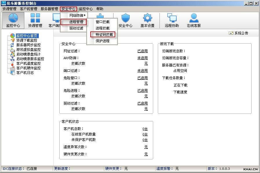 1.打开易乐游服务控制台,在菜单栏点击“安全中心”,出现下拉菜单,选择“进程管理”→“特征码拦截”
