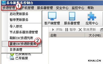 打开服务端,点击“资源管理”主菜单,在弹出的下拉菜单中选择“重建IDC资源数据库”,如下图所示。