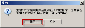 1. 根据功能入口的说明点击“重建IDC资源数据库”,弹出如下提示框,提示重建IDC资源数据库后要重新导入游戏;