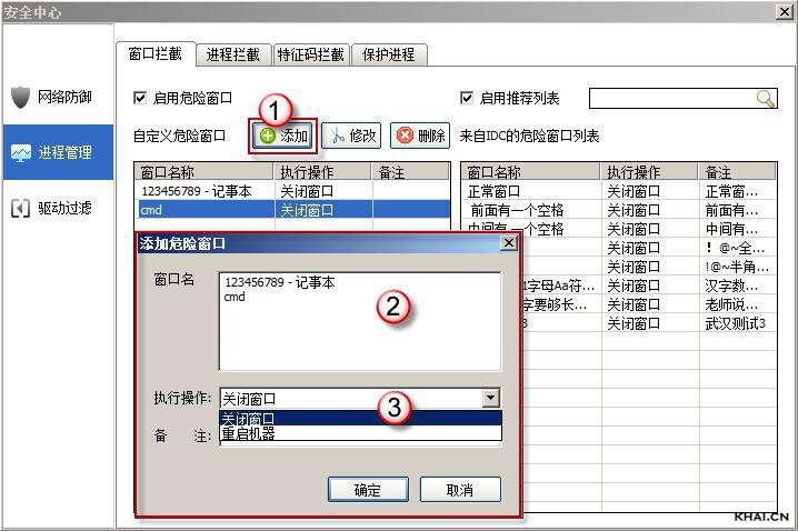 注释:在自定义危险窗口很多的情况下,用此功能可以迅速的找到已经添加过的窗口,来对它进行修改或删除