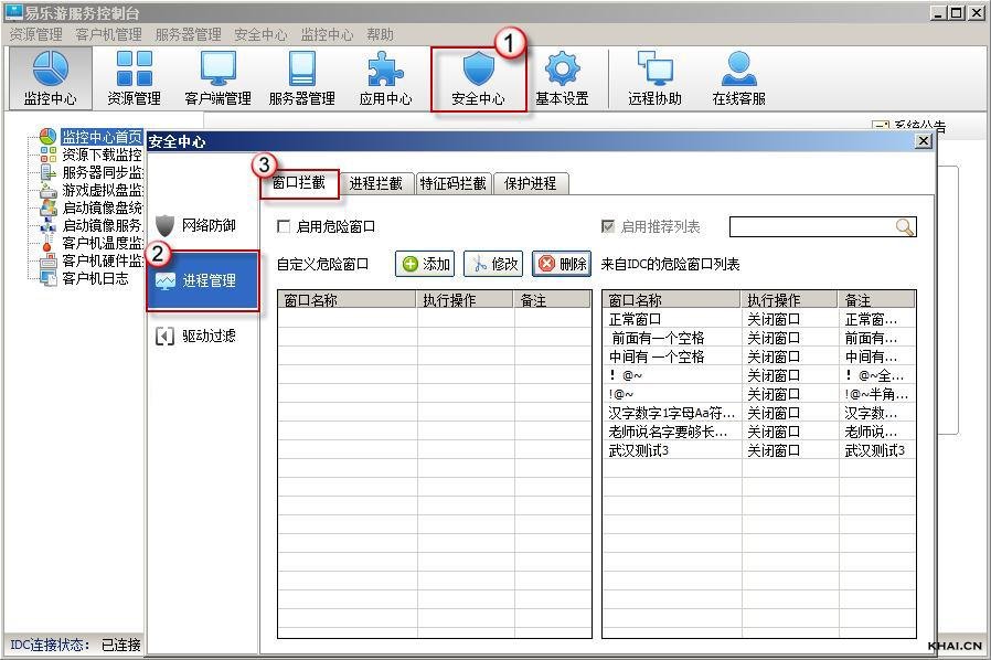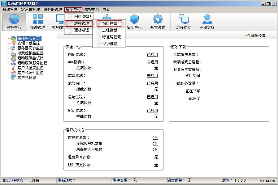 1.打开易乐游服务控制台,在菜单栏点击“安全中心”,出现下拉菜单,选择“进程管理”→“窗口拦截”