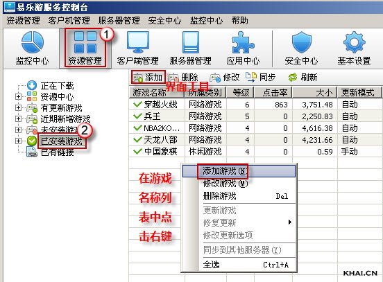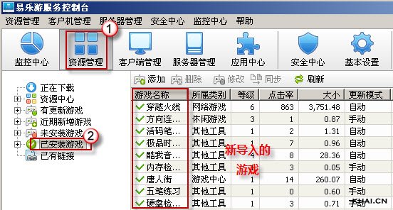 1. 打开服务端,点击资源管理大图标,选择左侧已安装游戏选项;
