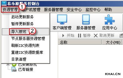 1. 打开服务端,点击“资源管理”主菜单,在弹出的下拉菜单中选择“导入游戏”,如下图所示;