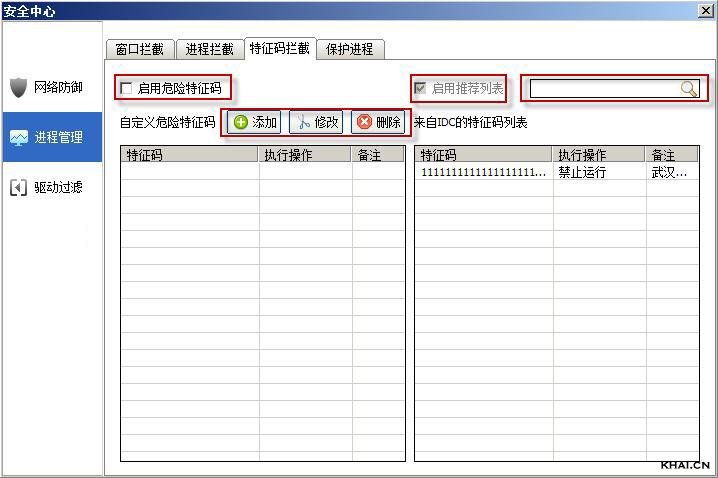 要使用特征码拦截功能,请勾选“启用危险特征码”,如果不勾选该项,后面的“启用推荐列表”及“搜索框”为灰置状态,不可使用;