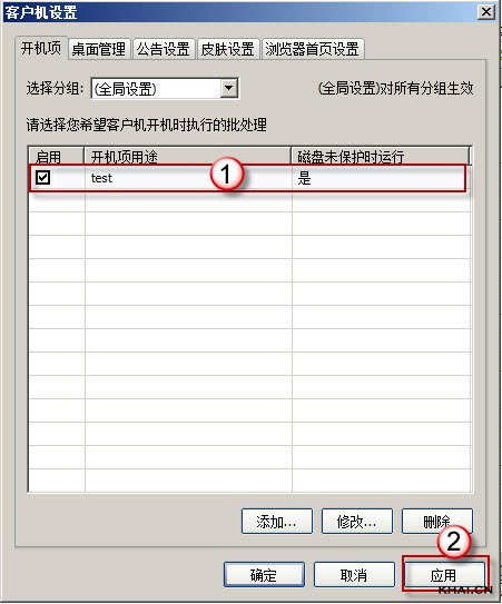 4.开机启动项如需调用文件,点击“添加文件”,可以将开机批处理调用的文件放在批处理文件同一目录下;然后点击“确定”,开机批处理会添加到列表中,然后勾选“启用”,点击“应用”,开启启动项设置成功,如图: