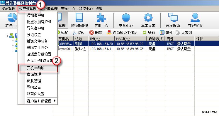 1.点击“客户机管理”-工具栏菜单-“开机启动项”;