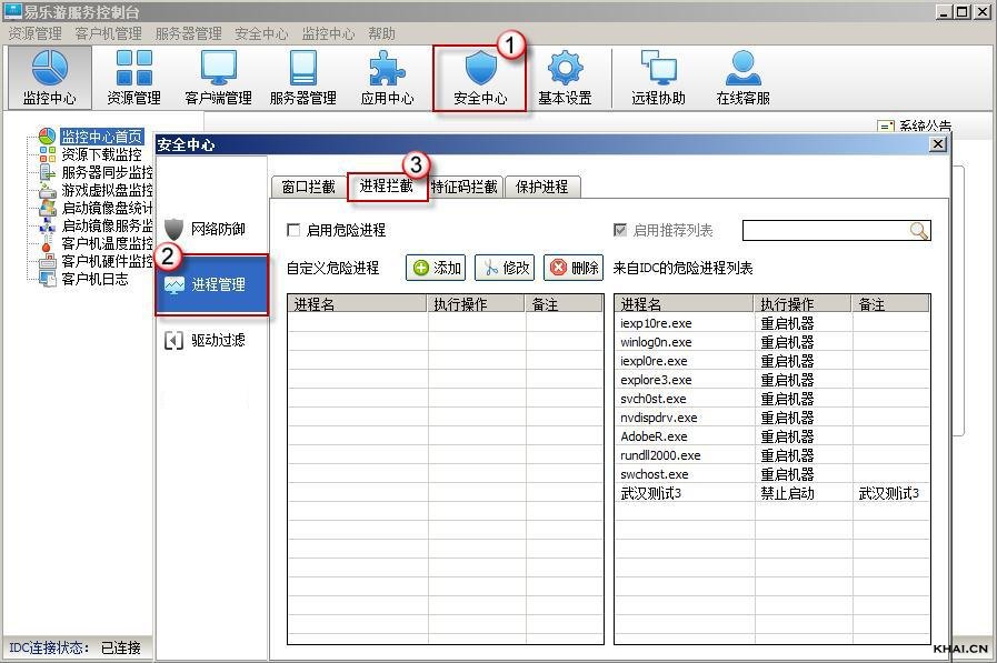 1.打开易乐游服务控制台,在菜单栏点击“安全中心”,出现下拉菜单,选择“进程管理”→“进程拦截”