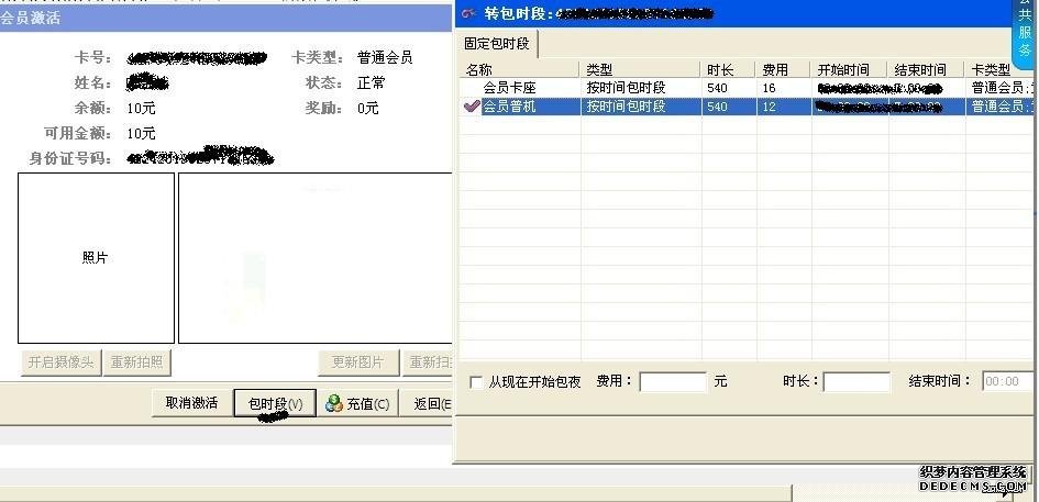 会员卡刷卡后,收银员在弹出的会员激活窗口中点“包时段”,选择要包时段的类型
