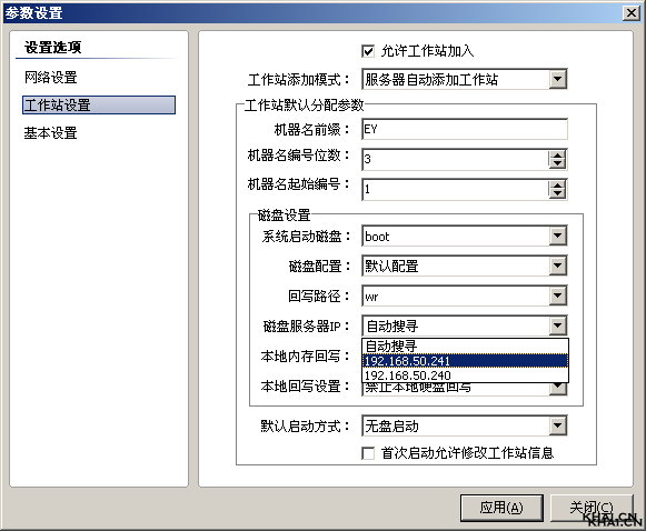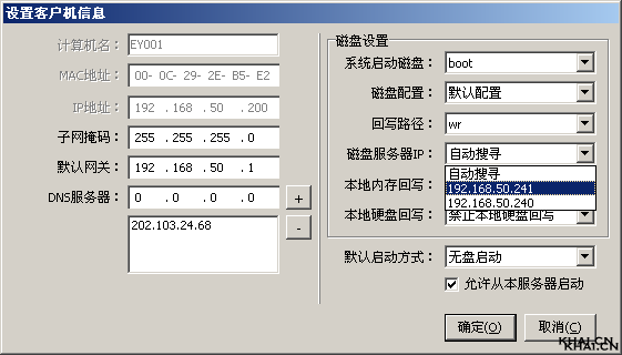 在无盘启动管理器工作站设置中,将“磁盘服务器IP”设为您希望客户机自动启动的服务器IP地址或者“自动搜寻”让客户机随机选择网卡进行启动。
