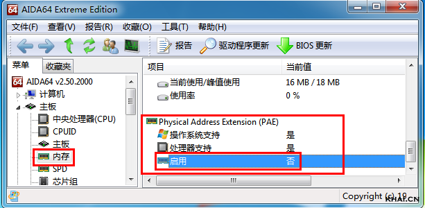 通常,我们可以借助一款名为AIDA的硬件检测软件,来查看当前系统的PAE支持情况,如下图:
